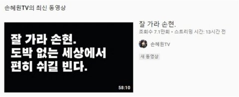 손 전 의원은 8일 유튜브 채널에서 ‘손현 잘가라’는 제목으로 약 58분간 실시간으로 방송했다. 방송영상 썸네일에 검은색 바탕에 흰 글씨로 ‘잘 가라 손현. 도박 없는 세상에서 편히 쉬길 빈다’라고 썼다.