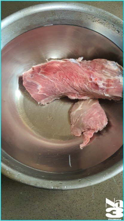 소고기는 일단 핏물을 빼야합니다. 그러니 마눌님 몰래 잘때 미리 찬물에 담궈서 빼주세요.