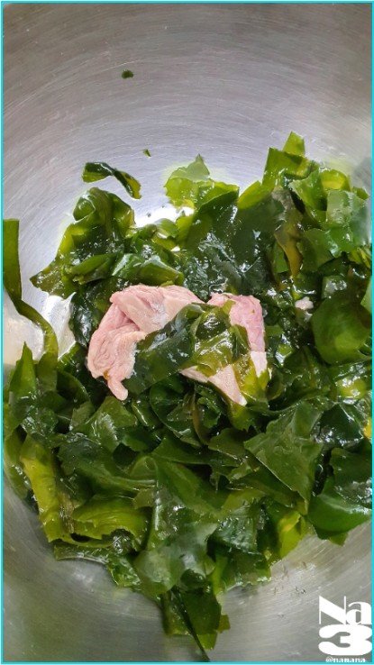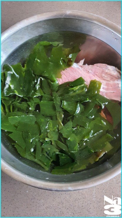 바로 사용하시면 안되고 미역과 고기를 다시 물에 빡빡 씻어주시고 꽈 짜서 가능한 물기를 제거해 주셔야 합니다.