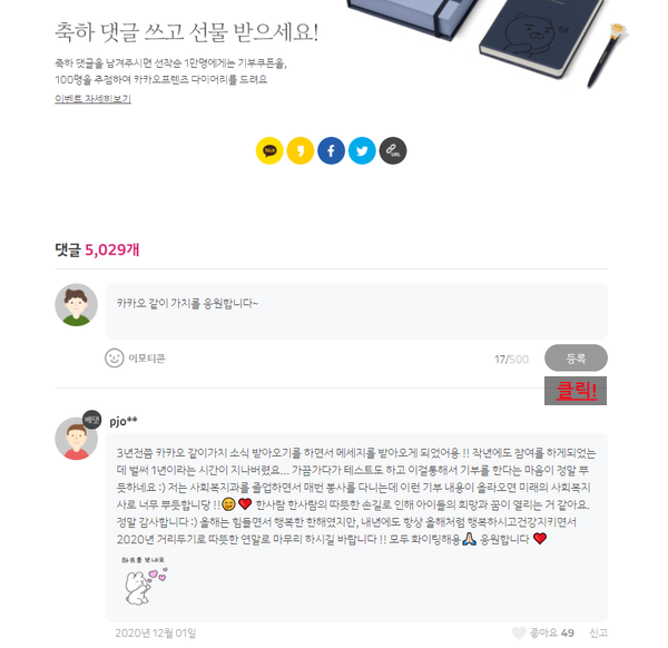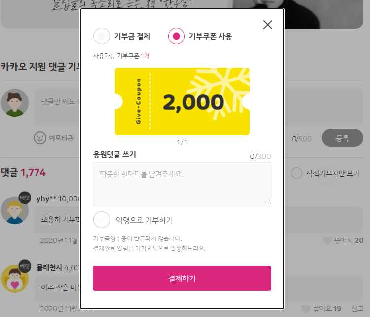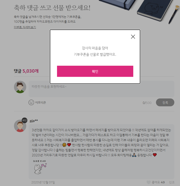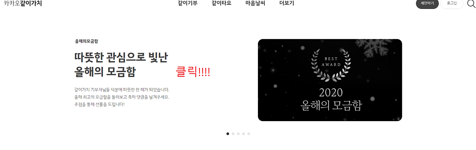 그리고 현재 카카오 같이가치 홈으로 접속하셔서 메인에 있는 올해의 모금함 배너를 클릭하시고 댓글만 남겨도 기부가 가능한 2,000원 쿠폰이 지급되고 있으니 이를 활용해주시면 감사하겠습니다!