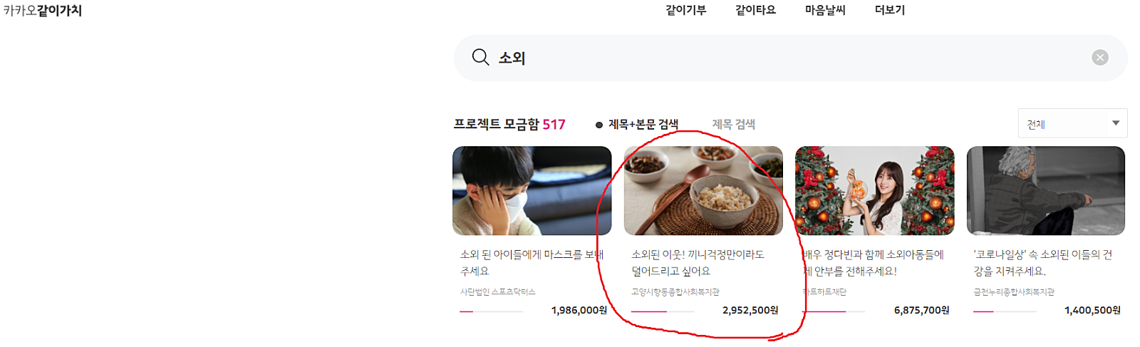 4. 소외된 이웃! 끼니걱정만이라도 덜어드리고 싶어요 : 카카오같이가치 (kakao.com) 로 접속한다!!!