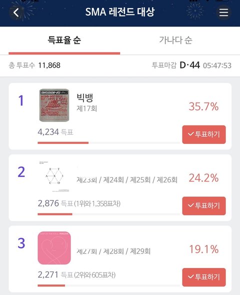 2위랑 표차도 천개 넘게 차이난다! 애들아 우리 잘 하고있으니까 안일하지말고 마지막까지 롱런해서 꼭 뱅이들 상 주자! 하루 열표씩 한달간 수고들 해줘!!