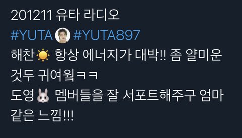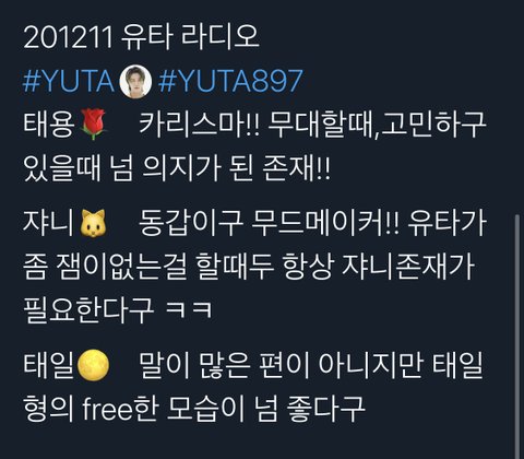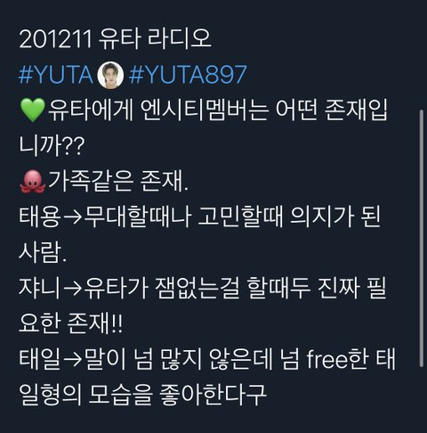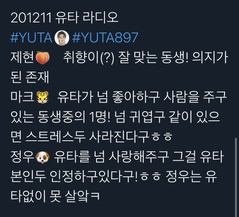 정우는 유타가 없으면 살 수 있을까할 정도로 유타한테 많이 의지하고 걱정많이 해준대(밥먹었어? 이런거ㅋㅋㅋㅋㅋㅋ)