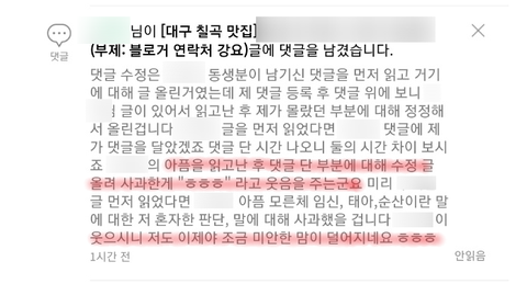 제가 황당하고 어이없어 ㅎㅎㅎ라고단 글을보며 ㅎㅎㅎ 웃으시네요웃으시니 제 마음이 편합니다라고 말합니다그러면서 다른 분들 댓글에 반박댓글을다시는 모습에 괜히 욱합니다