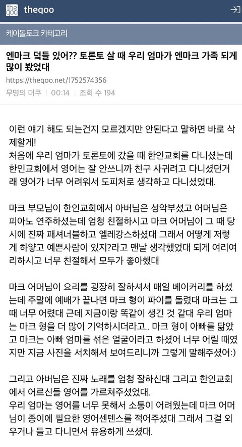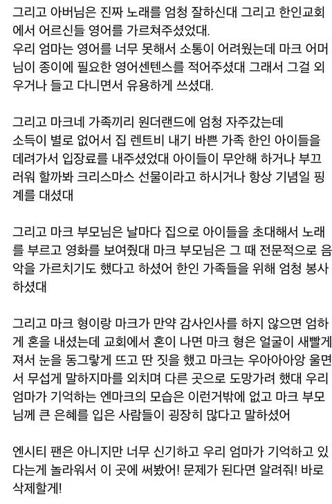 무섭게 말하지마 졸귀ㅠㅠㅠ그리고 마크 부모님은 복받으실듯 저렇게 좋은일 많이 하셨다니