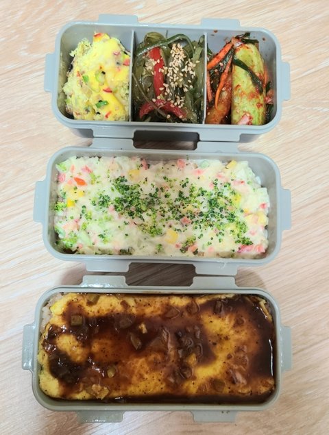 수제 데미그라스 소스를 얹은 오므라이스, 감자 샐러드, 계란찜, 미역줄기, 오이김치