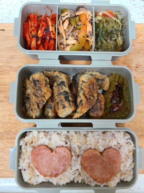 있는 반찬에 싸준 거라 미안한데 스팸 구워서 얹어주는 거라서 하트가 두개네요