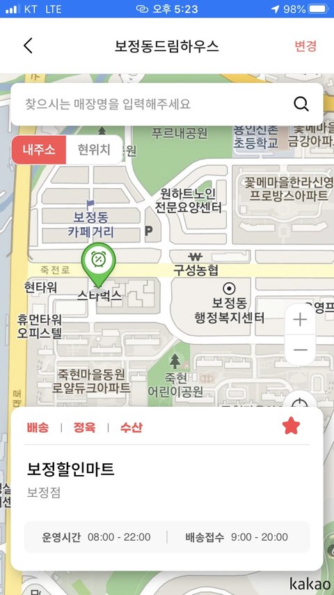 확인하기 어렵다면, '찾으시는 매장명을 입력해주세요' 클릭 후 '보정할인마트' 검색