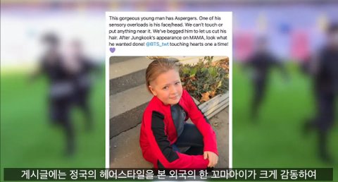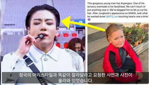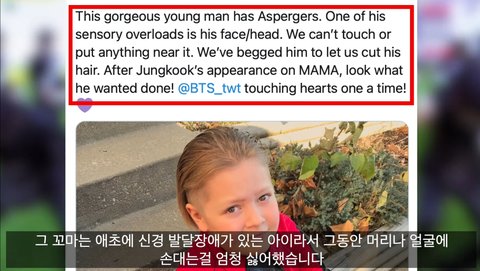 정국 - 발달장애아동이 정국이 머리보고 자기도 해달라고 함.