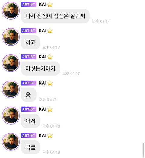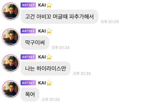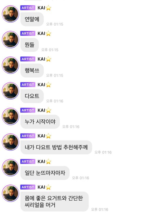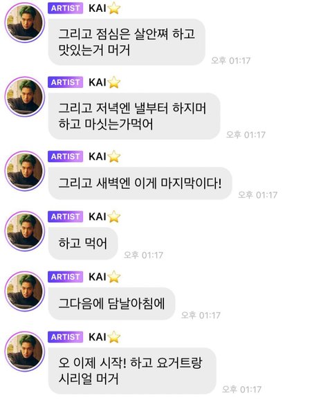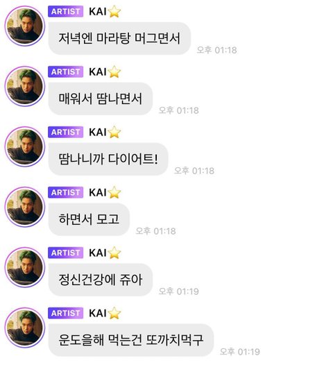 카이가 항상 하는 말이 본인은 직업이 아이돌이고 춤선을 위해 다이어트하는 거지만 정말 굶어서 하는 다이어트는 비추라 그랬어! 팬들은 맛있는거 많이 먹어야 된다구함