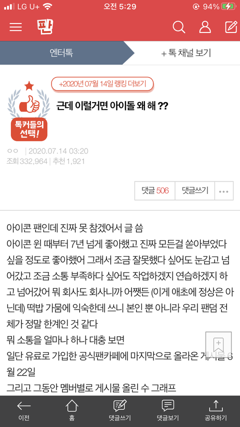 나 좀 억울하고 좀 짜증나 소통때문에 개빡칠순있지.. 근데 이런글때문에 전에 탈퇴때문에 이미지 안좋아졌었는데 또 이런글들로 안좋아져.. 조회수봐.. 아이콘 실력 멘탈 비주얼 다되는데 너무 속상