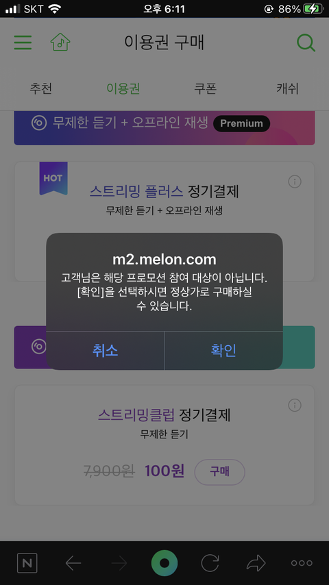 원래 유튜브 프리미엄 쓰다가 스밍돌릴려고 멜론 스밍 살려는데 왜 100원 프로모션이 안되는지 모르겠어 ㅠㅠ 멜론 안쓴지 거의 1년 다되가는데 뭐지?? ㅠㅠ