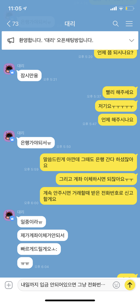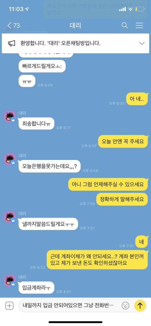이거 오늘 콜북 약간 예상과 다른 판매? 그런게 있었잖아 그래서 걍 환불받기로 했는데 계속이럼 내가 이 사람 전화번호랑 계좌 신고한다고 빨리 달라할까..? 우짜냐 나ㅜㅜㅜㅜㅜ