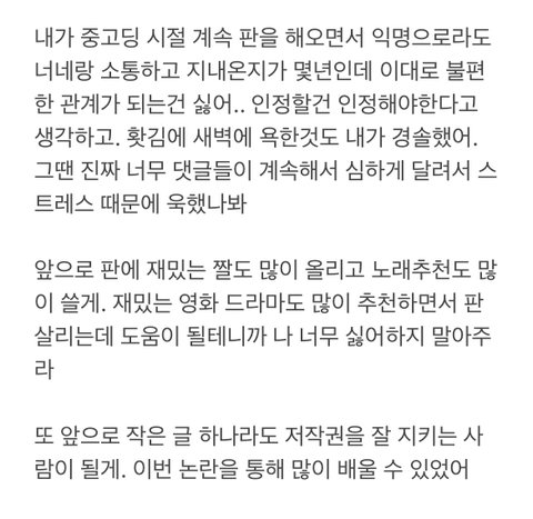 처음엔 단순히 내가 싫어서 다는 악플이라고 생각해서 내 자신은 못 돌아보고 원망만 했는데 많이 생각 할 수 있었고 많이 배울 수 있었어. 진심이야. 고마워