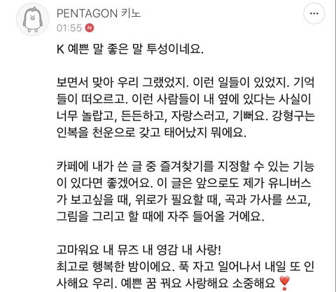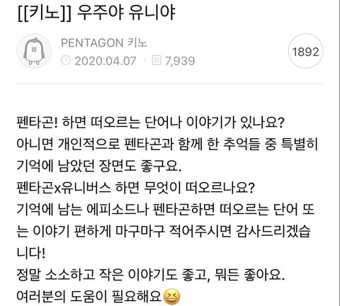 펜타곤과 유니버스만 알 수 있는 단어와 문장으로 만들어진 노래라서 너무 감동이고 뜻 깊었어!