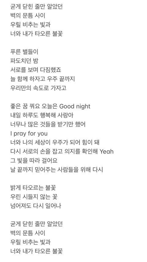 콘서트 엔딩에서 '불꽃 (Eternal Flame)' 이라는 미공개 곡을 불렀어. 이 노래는 사실 유니버스가 달아준 댓글을 가사로 만든 노래야ㅠㅠ