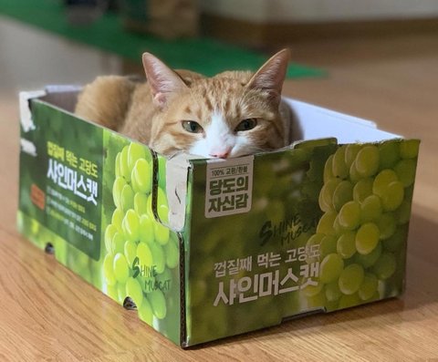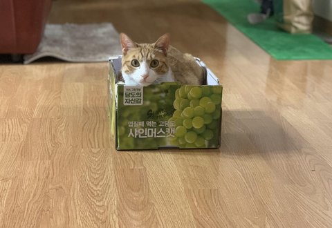 몸을 구겨넣은 하냥이. 집보다 박스를