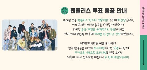 카카오톡 서포트팀 오픈채널로 자신이 트레저 팬인거 인증 보내면 팬플 투표 총공 계획을 개인적으로 알려준대!! 오픈채널 링크 : http://pf.kakao.com/_bTzfK