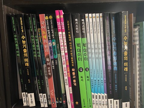 이게 내가 처분해야 할 책들이야..ㅋㅋㅋㅋㅋ 우리 부모님 아시는 분이 대학교 관계자셔서, 수능기출의 미래랑 수능완성 연구용 전과목을 주셨었어. 친구들에게 나눠주고 팔고 했는데 남은 게 이만큼이야..