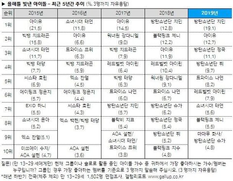 * 개인갤럽은 2015년에 시작해서 2세대 아이돌들이 비교적 적은편