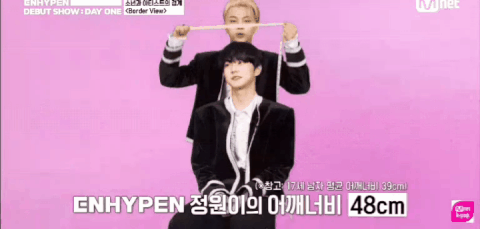 데뷔쇼 때 팬들이 궁금해하던거 풀어주면서 어깨 넓이 잼. 저 옷 뽕 안들어갔다고 멤버가 눌러주기까지 함. ㅠㅠㅠㅜㅜ 뭐야 양정원.... 성인 되면 어깨가 얼마나 더 넓어질ㄲ