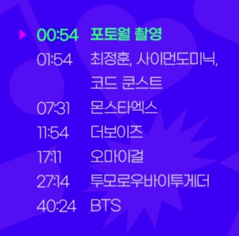 최정훈, 사이먼도미닉, 코드 쿤스트, 몬스타엑스, 더보이즈, 오마이걸, 투모로우바이투게더, 방탄소년단