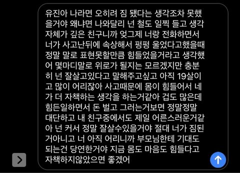 부모님몰래 오토바이알바하면서 대학다닐 돈 모으다가 사고나는바람에 크게다쳐서 수술했거든.. ㅠㅠ 그래서 애가 많이 힘들어서 부모님한테 짐됐다고 자책도 많이하는데 방금 연락으로 너무 힘들다길래 이렇게 써봣는데 어때..??ㅠ 도움이될까..? 들었을때 위로됐던 말있으면 알려주라... 내가 말을 잘 못해서...