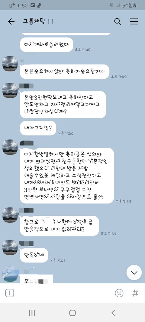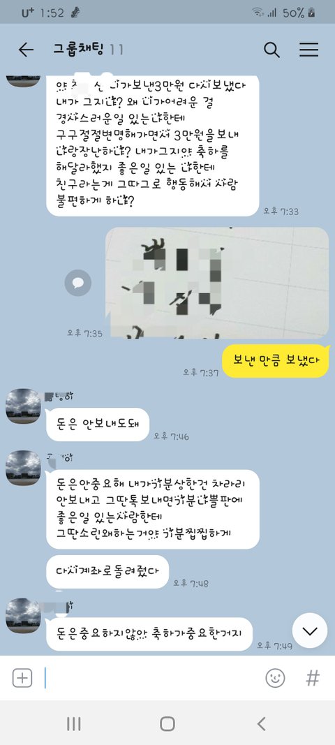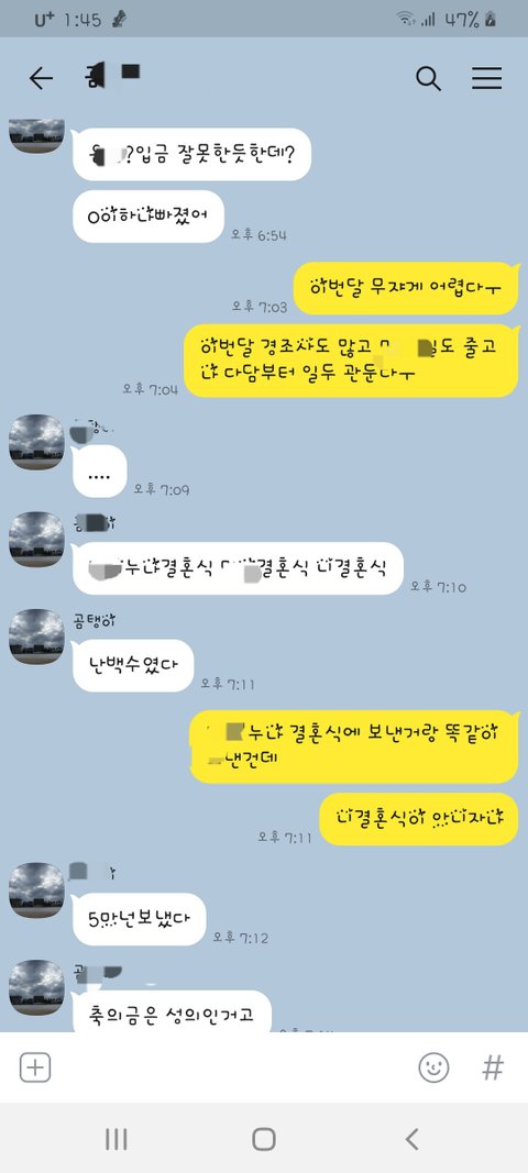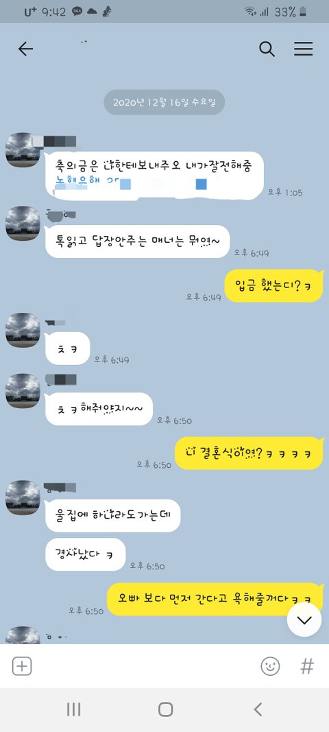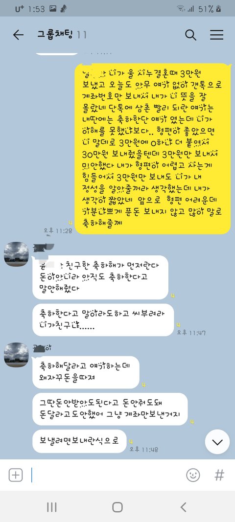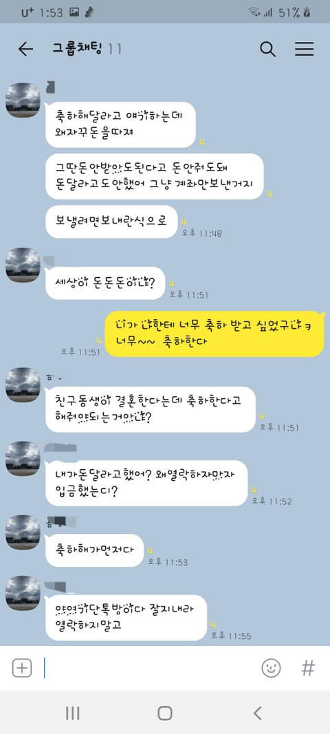 오늘 친구들 모임 단톡에 여동생이 결혼한다고 청첩장을 올렸어요 글고 저랑 남편 갠톡에 계좌번호를 똑같이 보냈어요