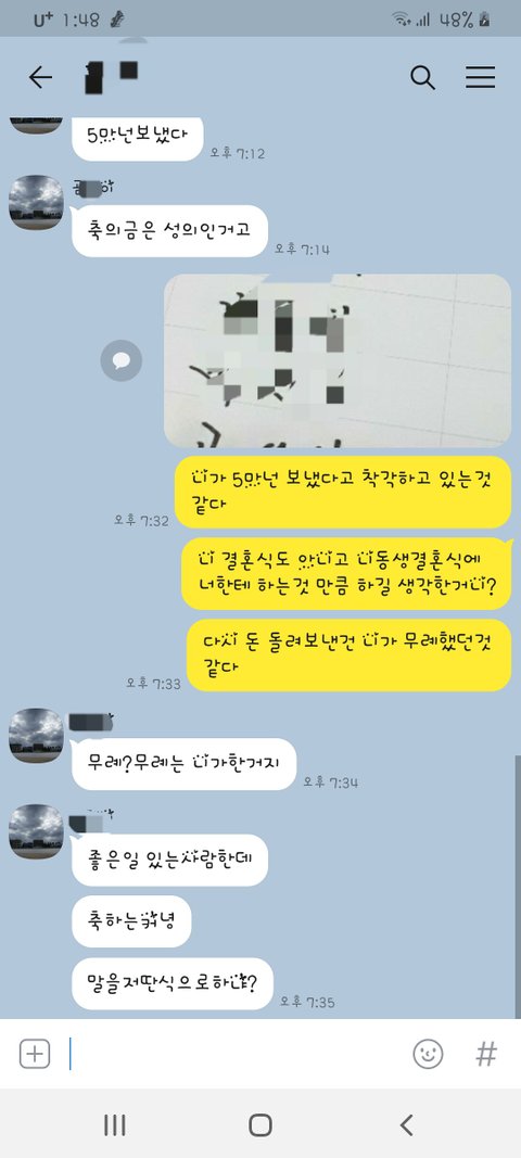 한친구가 제 첫번째 결혼식은 축의금만 보내고 두번째 결혼식에선 남편측에 십마넌 축의금 냈어요