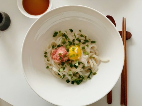 곱게 갈은 마와 명란젓, 노른자에 쯔유를 약간 넣어 잘 섞어먹는 우동