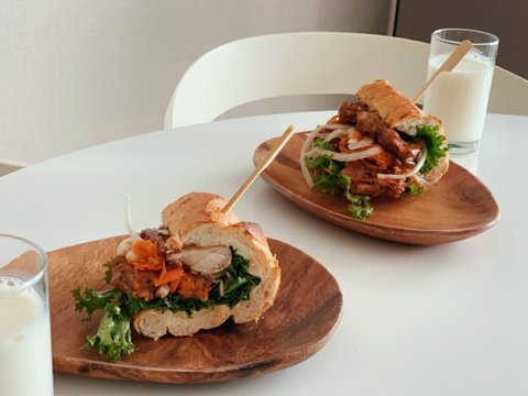 바삭하게 데운 바게트안에 채소와 새콤달콤한 당근절임