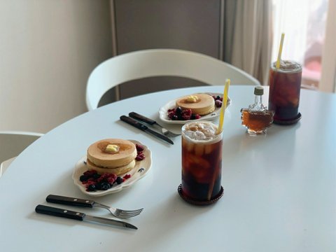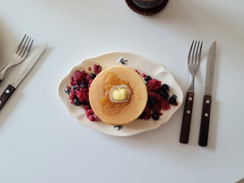 새콤한 블루베리와 라즈베리 맛으로 먹은 팬케이크