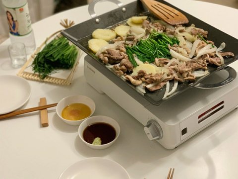 오리로스에 양파, 감자를 넣어 굽고 가운데는 부추를 익히며 먹어요