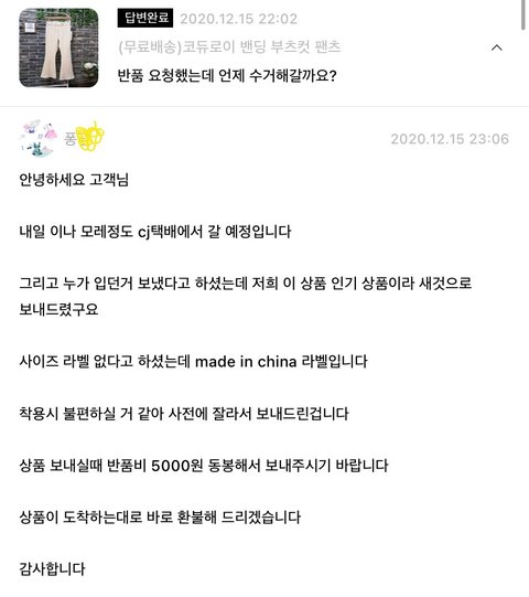 반품요청하고 퐁ㅇ 판매자한테 문의했더니