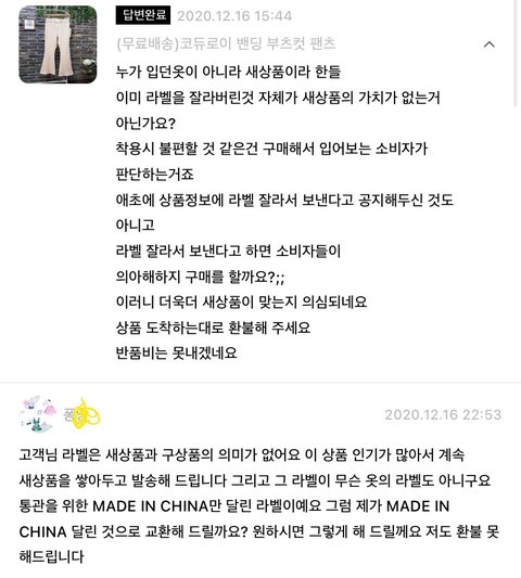 안쪽 엉덩이쪽 라벨도 누가 자른것마냥 잘려 있어서