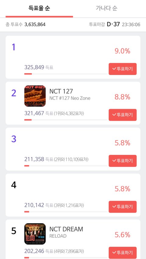1위랑 우리랑 계속 순위 엎치락뒤치락하는데 안 본새에 확 늘어났어 ㅠㅠㅠ 투표 안 한 사람 투표하자 ㅠ 드림도 좋은데 127이 높아서 몰아주는 게 좋을 것 같아!!