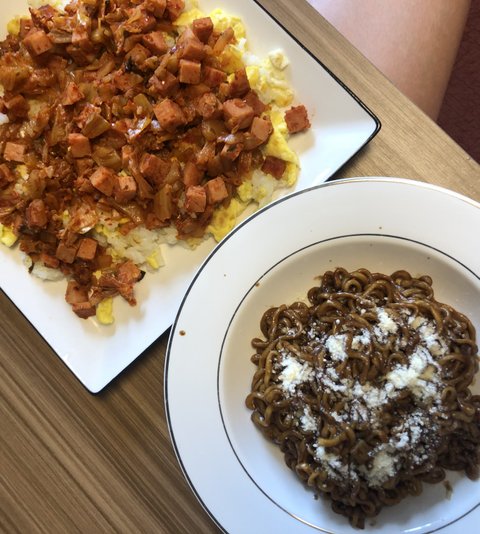짜빠게티에 파마산치즈가루솔솔 올리고 계란볶음밥위에 김치랑 고추참치, 스팸 볶아서 올려먹으면.. (맛없없)