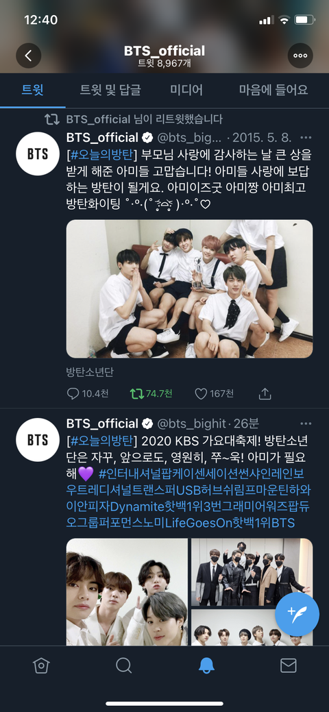 하나만 올릴께 이거 너무 충격적이라 ㅋㅋㅋ 방금 방탄 공식 트위터 계정 150508 방탄 1위 트윗 리트윗 함 ㄹㅇ 눈물 쏟아지게 하네 역시 아미 과몰입은 방탄이 만든다...