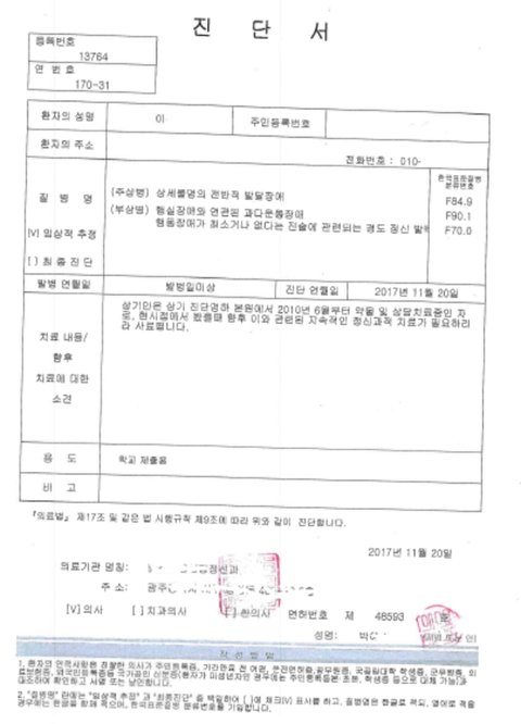어렸을 때부터 발달이 느린 아이었는데 아버지가 돌아가시면서 더 심해졌고, 꾸준히 정신과 치료를 받고 있대.