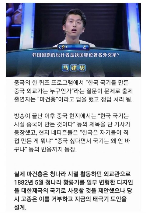 짱개는 이상한 팔괘진 모양의 국기를 제안했을 뿐, 백색 바탕에 현재의 태극기 디자인으로 승화시킨건 오로지 우리나라 내에서 이뤄진 거였음. 한복도 니들이 고려풍으로 잠시 돌려입은것 뿐이고ㅡ 제발 제대로 알고 우길걸 우겨라, 미친 짱퀴벌레들아ㅡ