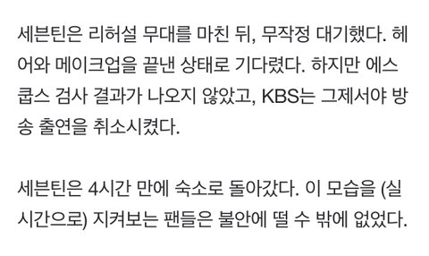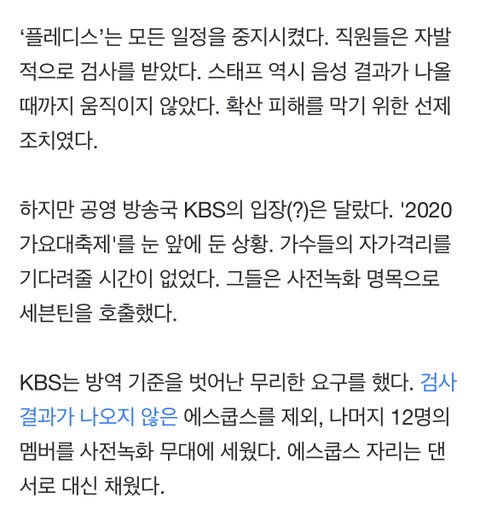 플디는 모든 일정 중지시키고 자가격리 하라고 했는데 KBS가 꾸역꾸역 불러내서 결과 안나온 에스쿱스 제외한 12명 리허설까지 시켜놓고 쿱스 결과 안나오니까 방송 직전에 취소시켰대