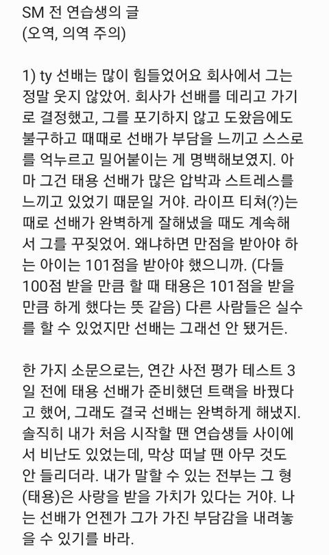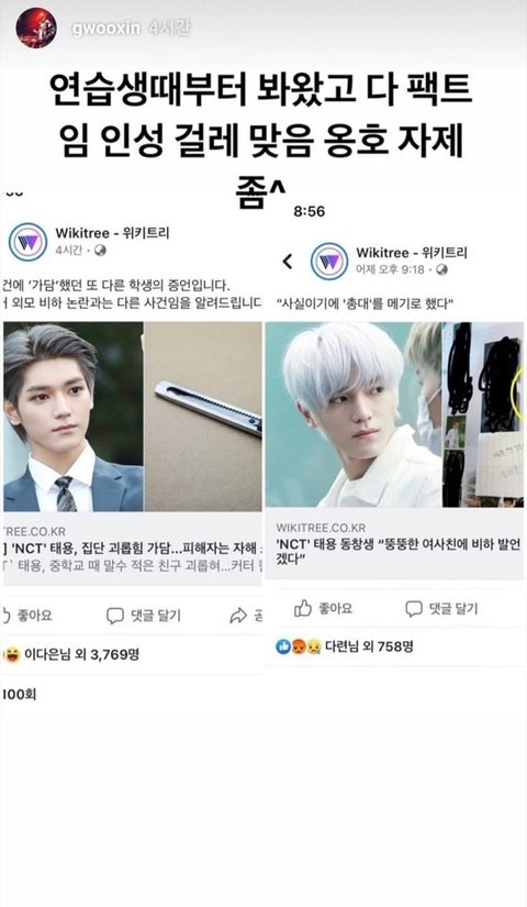 그리고 미안한데 나 이제 스무살이야 줌마저씨는 방구석에서 키보드 타닥타닥 태용 인성 글이나 날조하는 너네 같은 꿔보들 아닐까 아 늙어서 신조어 뜻 모를까봐 알려줄게 꿔다놓은 보릿자루라고 ㅇㅇ