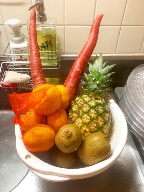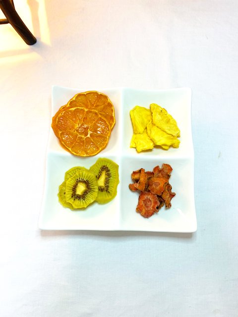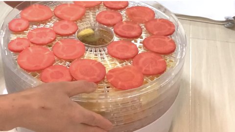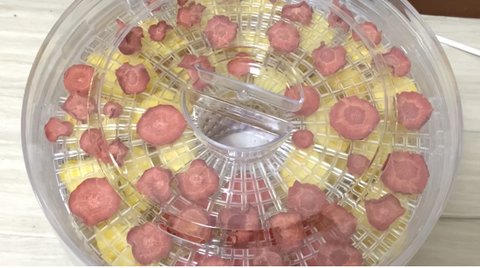 그리곤 건조 틀에 올리고 파인애플 역시 잘 손질해서 건조 틀에 올려준다.귤이 가장 시간이 걸리므로 입고 있으면 알아서 건조된다.다듬은 빨간 당근도 같은 두께로 슬라이스하고다른 것들과 함께 건조틀에 올리고