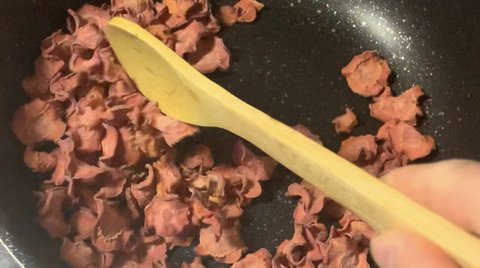 시간이 경과해서 딱딱하게 건조된 당근은후라이팬에 기름없이 볶아주며 남은 수분을 날려준다. (당근은 요리에도 사용가능하다.)첨가물없이 100% 로 건조한 드라이 후르츠가 된다.