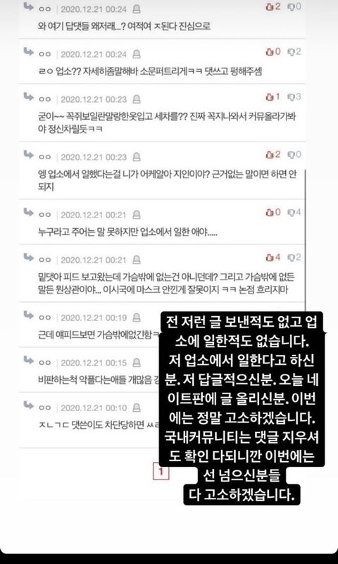 지금이야 쫄아서 다 지웠겠지만 댓글에서 쓰레기같은 여론 조성하고 허위사실 유포한 애들 고소한다고ㅋㅋ 근데 지워봤자 의미없는건 알지?저런거라도 전과있으면 인생 귀찮아질텐데ㅋㅋ 똥줄좀 타봐라 얘들앙