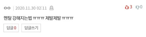 나는 나를 항상 최우선으로 생각하는게 제일 중요한거같아! 그래야 내 자신을 내가 잘 케어할수 있고 점점 더 단단한 사람이 될수 있는거같아 근데 가끔씩 멘탈을 잘 유지하다가 갑자기 터져버릴때는 유튜브에 약간 멘탈관련 명언? 그런거 찾아보는편이야 내 본진이랑 내가 좋아하는 운동선수가 그런말을 많이해서 그런가 더 와닿고 힘이 되더라고!