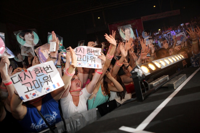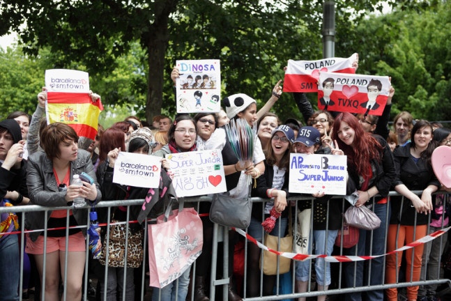 2011년 파리에서 열린 에스엠(SM)타운 라이브를 보러 온 팬들. 이들은 공연 시작 5시간 전부터 공연장인 르 제니트 드 파리 앞에 모여 있었다고 한다. 소녀시대, 동방신기, 슈퍼주니어, 샤이니 등이 무대에 올랐다. 현지 언론은 ‘예매 시작 15분 만에 이틀치 1만4천여석의 입장권이 매진됐다’고 소개하기도 했다. 에스엠엔터테인먼트 제공