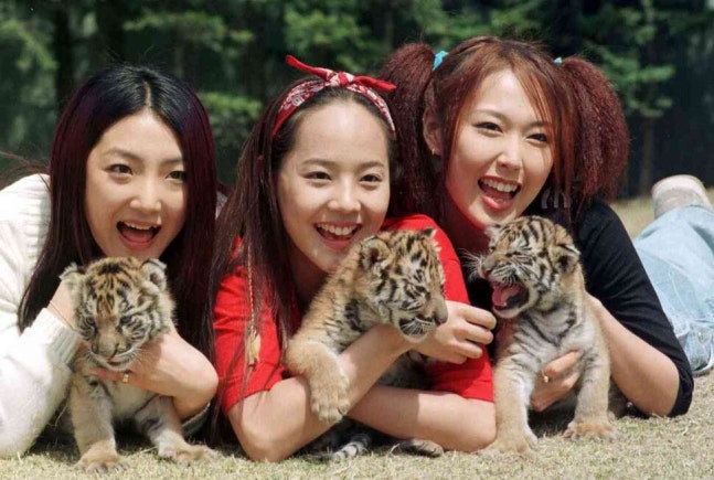 경기도 용인 에버랜드에서 인기그룹 에스이에스(S.E.S)가 자매결연을 맺은 벵골산 호랑이를 품에 안고 활짝 웃고 있다. 이수만은 에스이에스와 함께 처음으로 일본 시장의 문을 두드렸다. 강창광 기자가 찍었다.