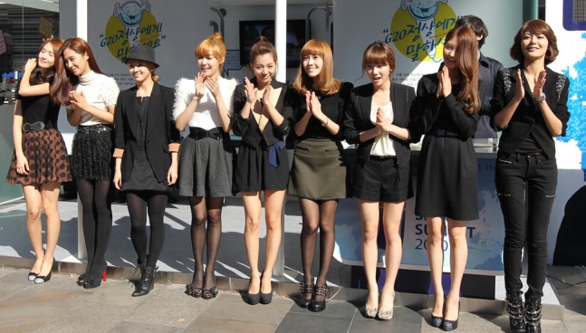소녀시대가 2010년 서울 강남구 삼성동 코엑스 밀레니엄 광장에서 열린 G20 스타서포터즈 행사에 참석해 박수를 치고 있다. 소녀시대는 한국 걸그룹의 역사에서 가장 성공한 그룹으로 평가받는다. 김진수 기자가 찍었다.