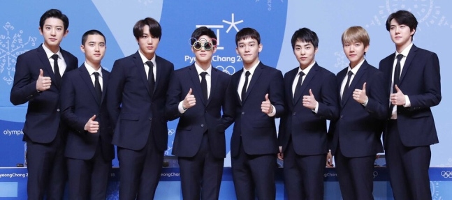 엑소 멤버들이 2018년 강원도 평창 메인프레스센터에서 열린 폐막식 관련 기자회견에서 포즈를 취하고 있다. 엑소의 멤버 카이는 평창 올림픽 폐막식에서 독무를 펼쳐 주목받기도 했다. 박종식 기자가 찍었다.